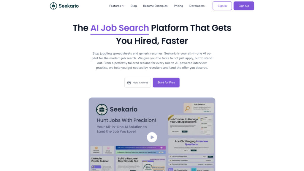 Streamline your job search with Seekario AI. Create professional resumes, tailored cover letters, and optimize your LinkedIn profile. Prepare for interviews with AI-powered tools. Try free today!