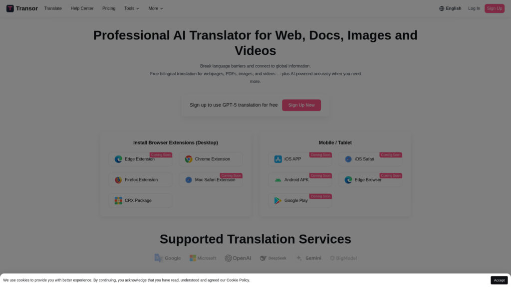 Break language barriers instantly with Transor AI. Real-time bilingual translation for websites, videos, PDFs, and images. Powered by ChatGPT, Gemini, and Claude. Try free today!