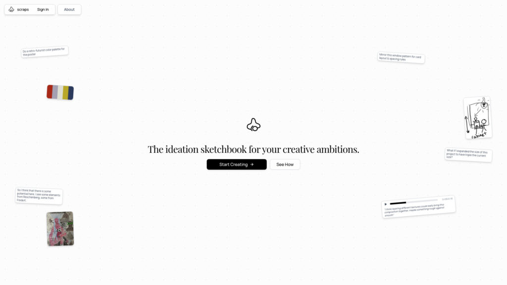 scraps is an AI-native sketchbook for creative ideation. Capture photos, texts, audios & sketches. Find idea connections, brainstorm campaigns, and build your knowledge base. Try free!