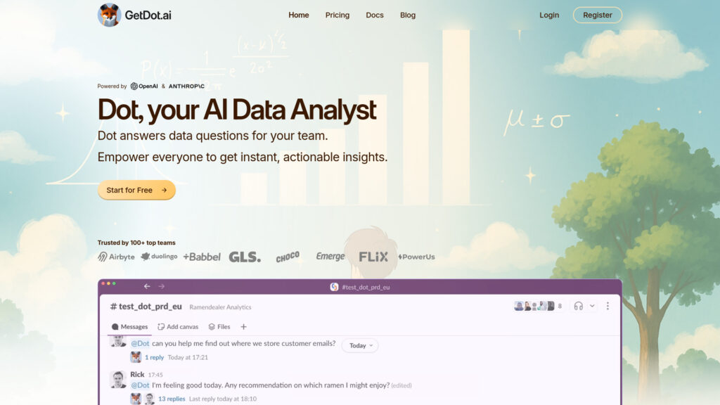 Dot is your AI data analyst in Slack & Teams. Analyze data with natural language—no SQL needed. Connect to Snowflake, BigQuery, Redshift & more. Try free today!