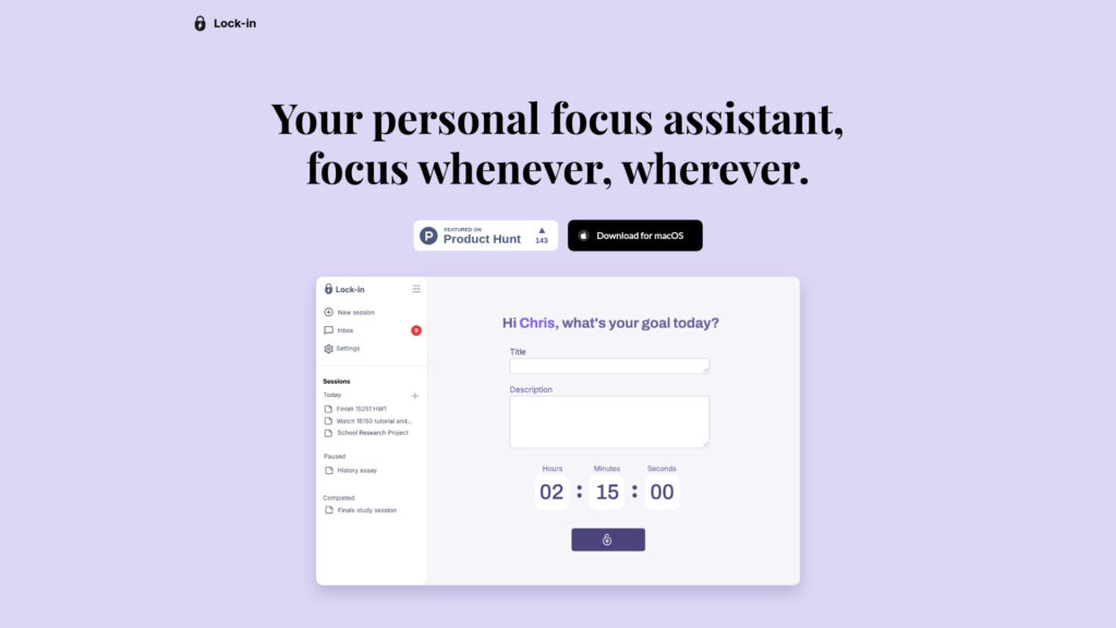 Lock-in AI helps you maintain focus and boost productivity with smart nudges, adaptive breaks, and session insights. Prevent burnout while achieving peak performance. Try now!