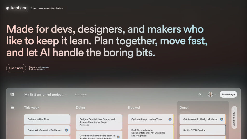 Kanbanq - AI-Powered Project Management Tool Introduction. Kanbanq is a modern AI project management tool for developers and teams. Get AI-powered task breakdowns, sprint summaries, and visual Kanban boards. Start free, no signup required!