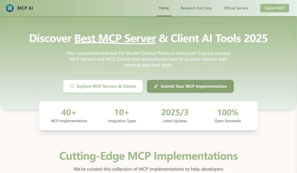 MCP AI Tool Introduction. MCP AI is the definitive directory for Model Context Protocol implementations. Discover curated MCP Servers and MCP Clients for seamless AI integration. Compare features, capabilities, and documentation to enhance your AI applications with the best MCP tools available in 2025.