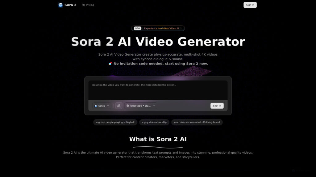 Sora 2 AI - AI-Powered Video Generator Tool Introduction. Transform text and images into stunning 4K videos with Sora 2 AI. AI-powered video creation with synced audio, physics-accurate motion, and professional quality. Try free today!